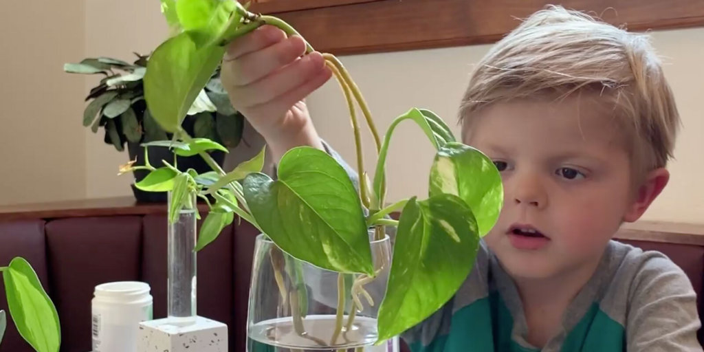 Simply place the cut end of a stem in water. After a few weeks in a bright, warm spot, roots will begin to grow. When they reach 1-2″ long, the plant can be transferred to soil. Read our guide on how to propagate trailing plants for full instructions. Encourage kids to observe changes daily—some may enjoy taking notes, recording measurements, and sketching pictures as the plant develops roots and new leaves!