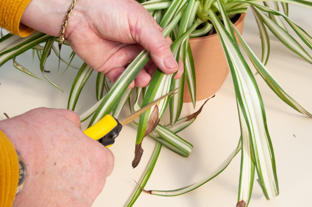 Trim and remove dead or dying leaves from your plant with sharp scissors or pruning shears, wiping with rubbing alcohol between each snip. This will help the plant send energy to the healthiest leaves, as yellow and brown crispy leaves will not turn green again. Gently remove fallen leaves from the soil to ensure even distribution of the fertilizing liquid.