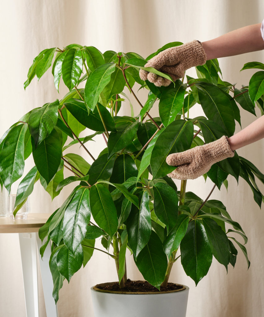 - Finally, wipe down each leaf using a wet cloth or dusting gloves. Leaves can gather a layer of dust that limits their ability to function effectively, so cleaning not only makes them look more beautiful, it also helps them grow faster.